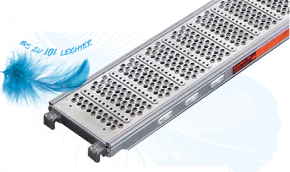 Dokładnie to osiągnięto w przypadku stalowego pomostu Lightweight. Dzięki zastosowaniu gatunków stali o wyższej wytrzymałości na rozciąganie, cieńszego materiału oraz inteligentnego profilowania i koncentracji materiału w istotnych konstrukcyjnie obszarach, możliwe okazało się zmniejszenie masy stalowego pomostu, który ma już ugruntowaną pozycję na rynku, nawet o 2,2 kg lub 10% – przy jednoczesnym zachowaniu jego wysokiej nośności. Dzięki temu stalowy pomost jest lżejszy, poręczniejszy i bardziej efektywny.